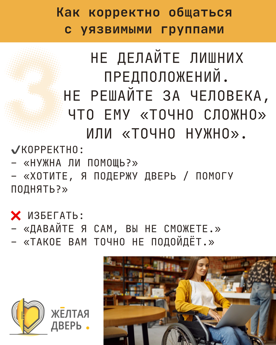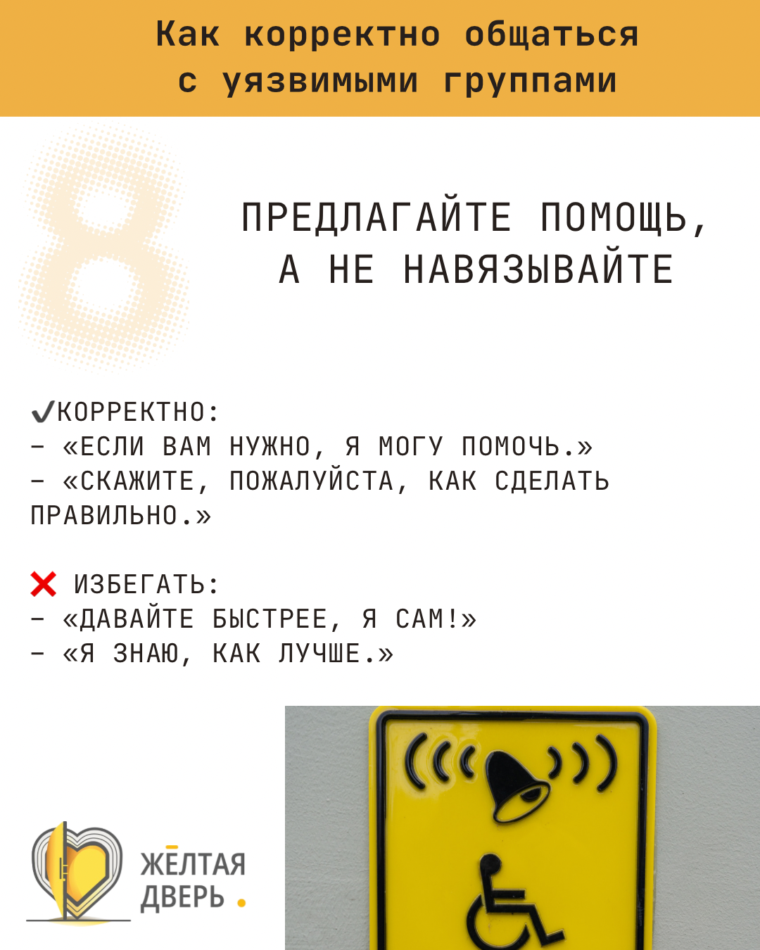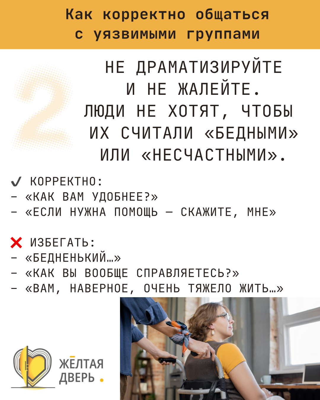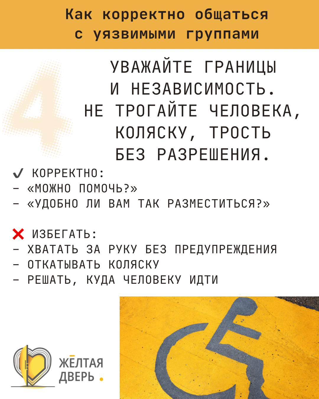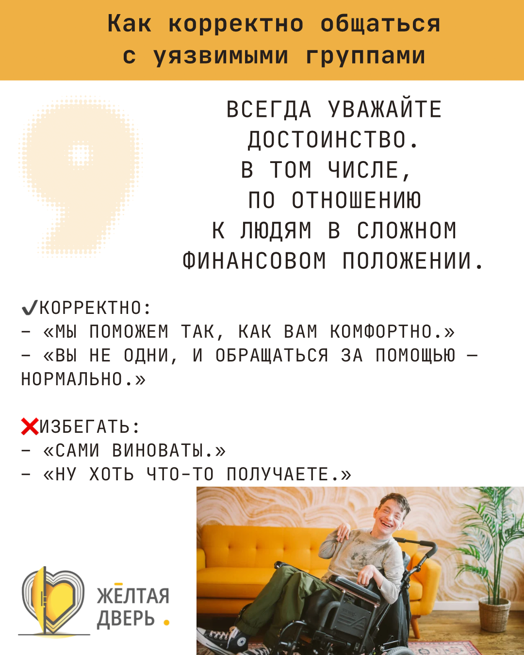 Эта памятка — про то, как говорить так, чтобы рядом с вами всегда было спокойно и достойно. Про то, как ставить человека в центр взаимодействия. Про то, как предлагать помощь, а не навязывать её, и как уважать границы, даже если очень хочется «сделать добро».