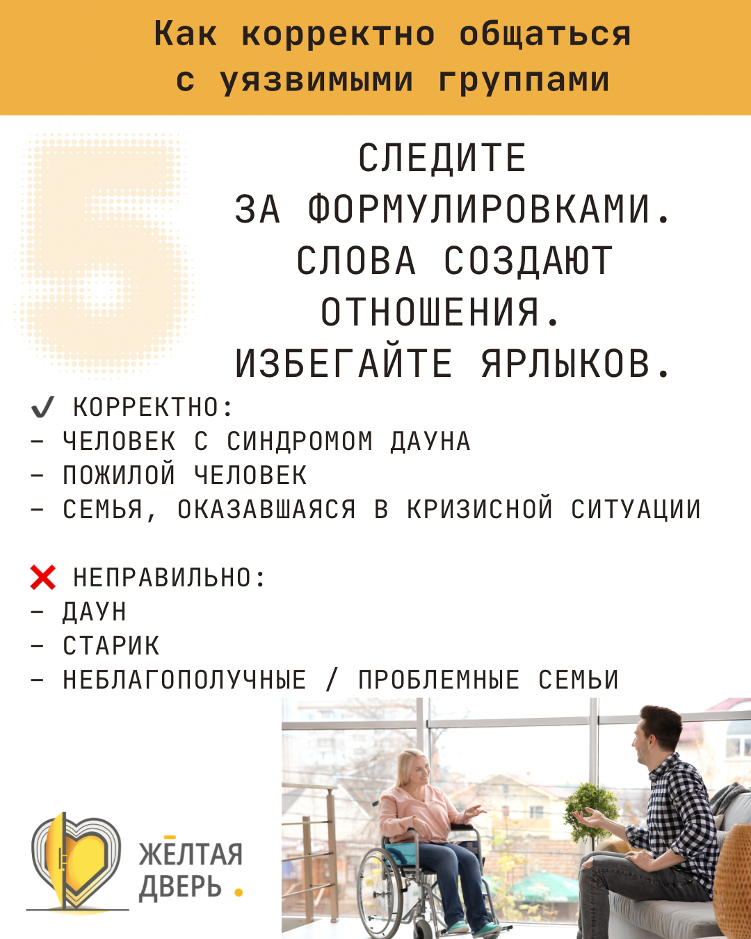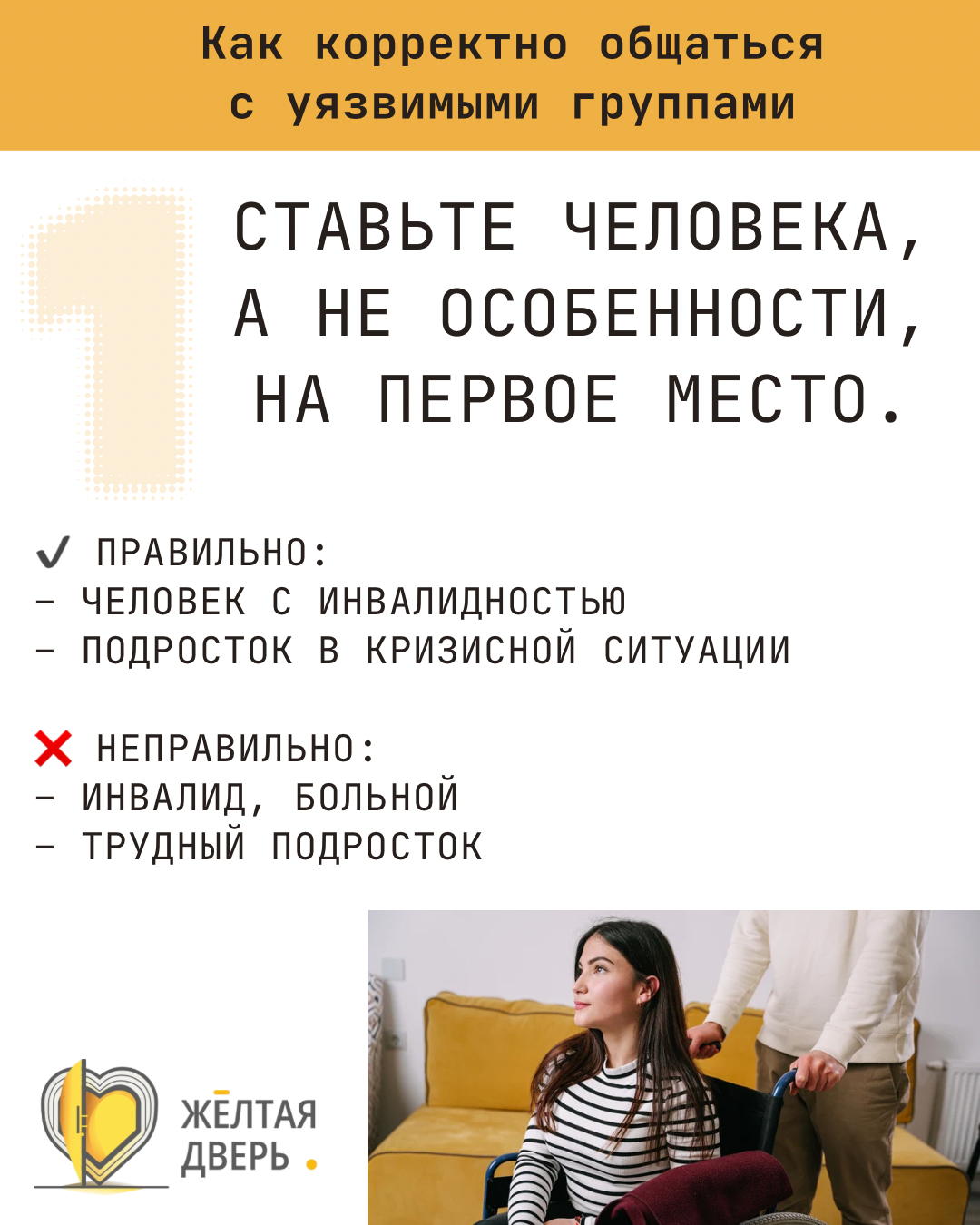 Общение с уязвимыми группами — это всегда проверка на зрелость, уважение и человечность. Часто мы даже не замечаем, как привычные фразы ранят, уменьшают или ставят человека в позицию «проблемы». Но слова — это не мелочь. Они формируют атмосферу: безопасную или унизительную, поддерживающую или обесценивающую.