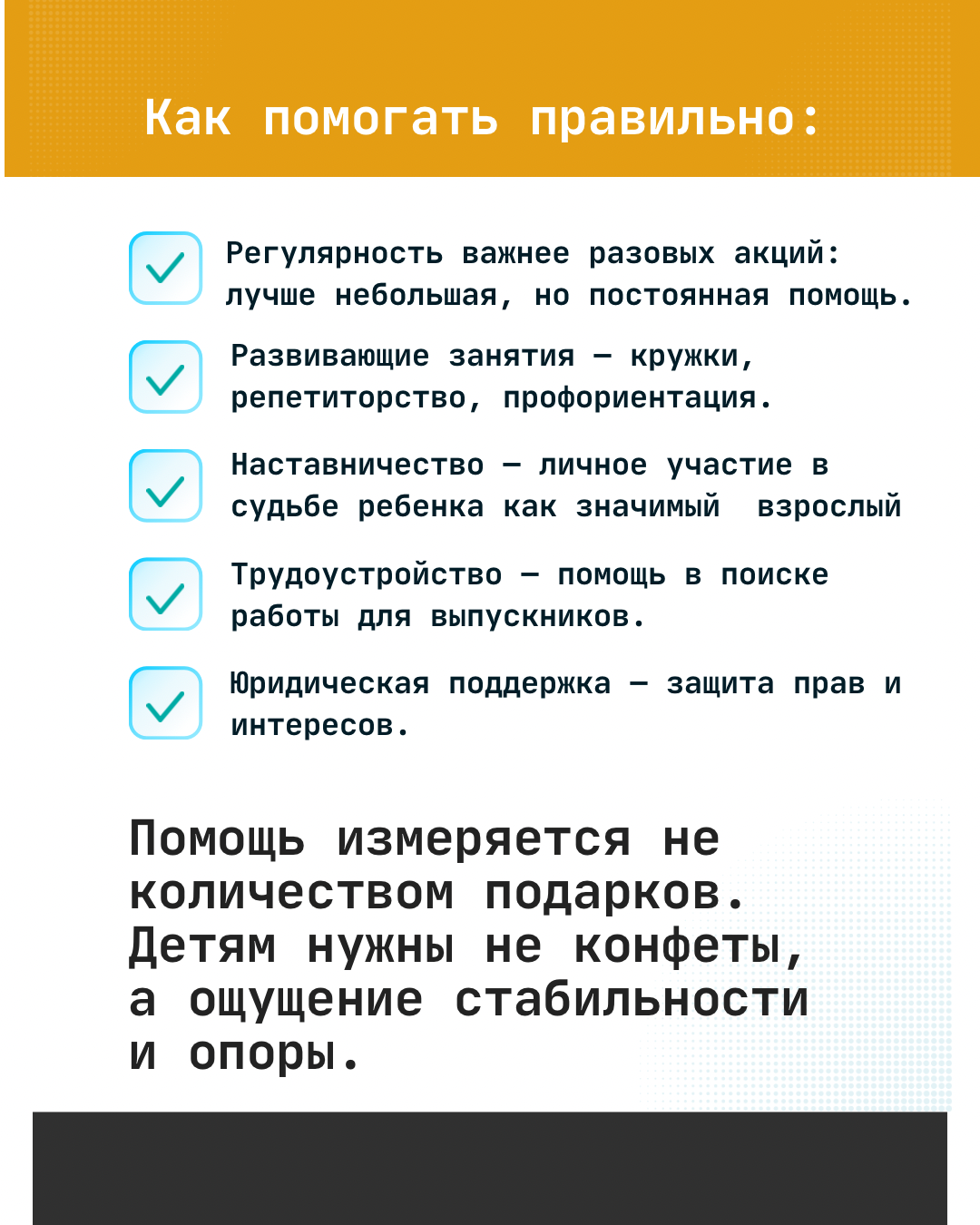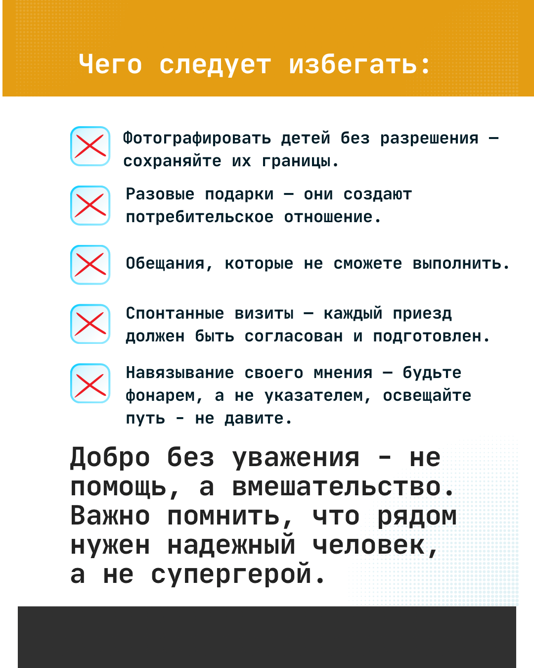 · Поддержать фонды и НКО, работающие по принципу «не навреди» и помогающие осознанно, а не разово.